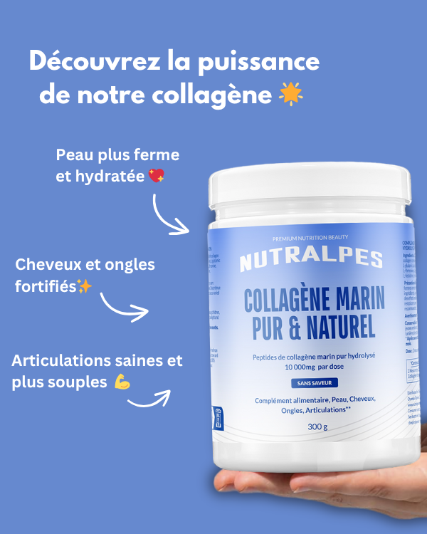 Nutralpes Collagène Marin hautement dosé soutient peau, articulations et bien-être. Collagène hydrolysé pur, fabriqué en France. Beauté, mobilité, vitalité : votre cure marine quotidienne naturelle.