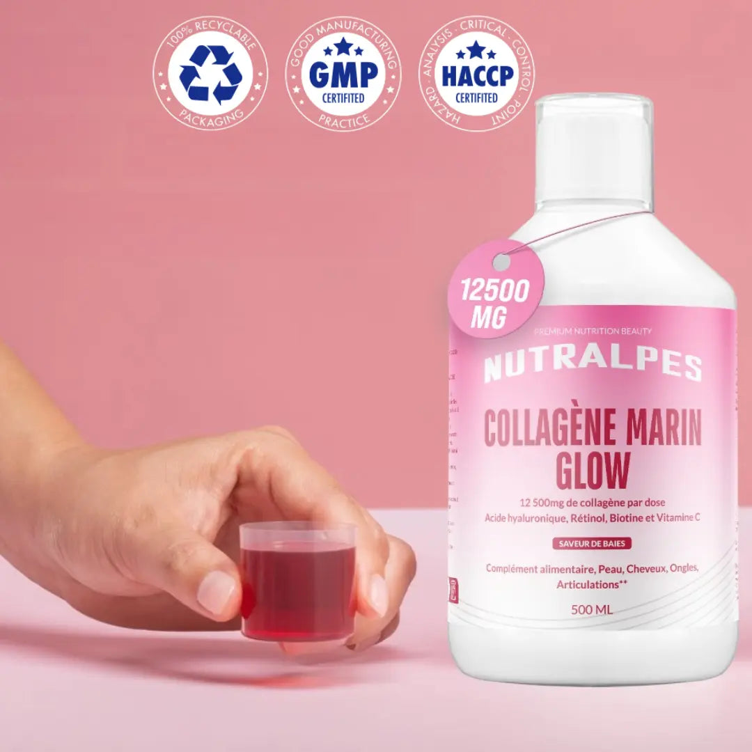 Découvrez Nutralpes Collagène Marin Glow, une synergie puissante de 12 500 mg de peptides de collagène marin hydrolysé, enrichie de 14 ingrédients actifs hautement efficaces, dont l’acide hyaluronique et la vitamine C. Ce complexe d’exception contribue à ralentir le vieillissement cutané et à restaurer l’éclat naturel de la peau.